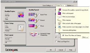 تظهر قائمة "أريد أن" عند قيامك بفتح خصائص الطباعة. تحتوي هذه القائمة على مجموعة متنوعة من معالجات المهام - طباعة صورة فوتوغرافية، طباعة ظرف، طباعة شعار، الطباعة على كلا وجهي الورقة، طباعة ملصق - للمساعدة في تحديد الإعدادات الصحيحة للمشروع.