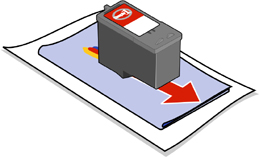 - Jemně podržte hadřík na tiskových tryskách po dobu tří sekund a potom je otřete v uvedeném směru.
