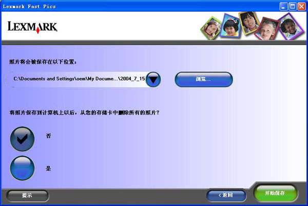 按照屏幕上的提示指定您希望将照片保存到哪个文件夹。