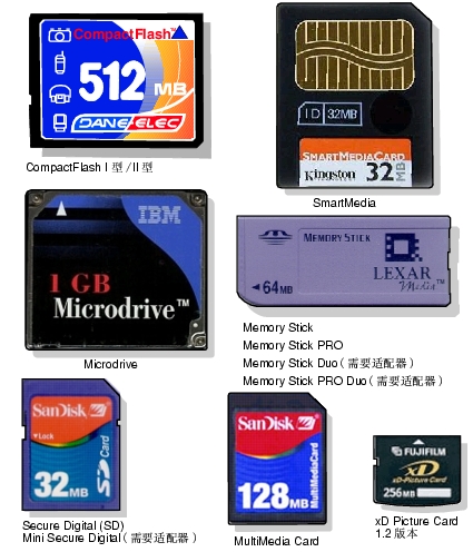 注意:如果您使用的是SmartMedia存储卡,请确认金色的触点区域朝上。 注意:如果您使用的是Memory Stick Duo、Memory Stick PRO Duo、或Mini Secure Digital存储卡,请将存储卡插入随同存储卡一起提供的适配器中,然后将适配器插入插槽中。 |