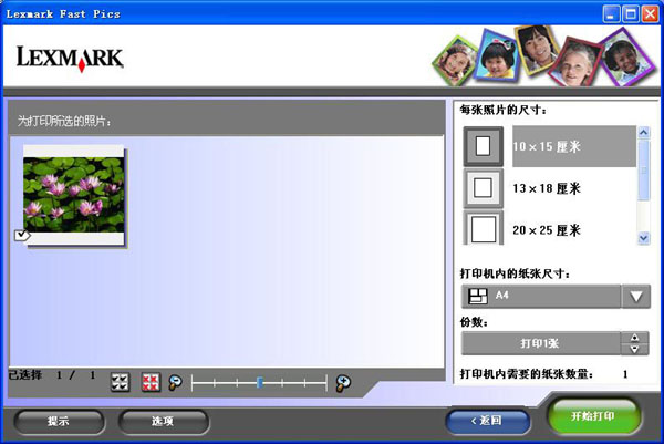 - 为每一张照片指定照片大小、多功能一体机内的空白纸尺寸、以及打印份数。
