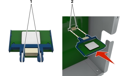 拿出卡的两边,将卡上的塑料接插脚(1)与控制器板上的孔(2)对齐。