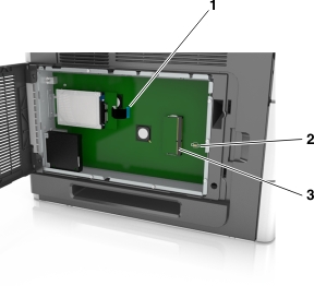 1 | Lexmark 内置方案端口或打印机硬盘连接器 |