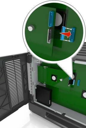 从控制器板上拔掉打印机硬盘接口电缆,让电缆仍然连接在打印机硬盘上。为拔掉电缆,请在拉出电缆之前捏住接口电缆插头上的销子来释放插销。