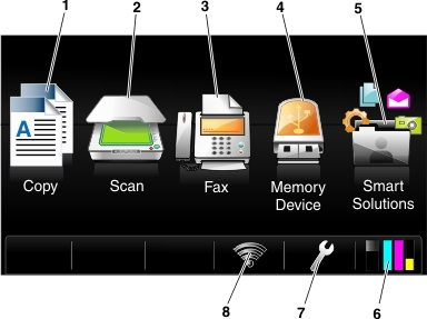4 | 存储设备 | 查看、选择或打印照片和文档。 注意: 只有当存储卡、闪存驱动器连接在打印机上,并且您返回到主界面时,此图标才会出现。如果PictBridge兼容数码相机已连接到打印机,但内存卡不在卡插槽时,此图标不会出现。 |