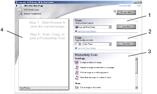 לאחר פתיחת מרכז ה- All-In-On, מוצג הדף הראשי של ה- All-In-On. הדף מורכב מארבע חלקים עיקריים: סריקה, העתקה, כלים לשכלול העבודה והחלק תצוגה מקדימה.