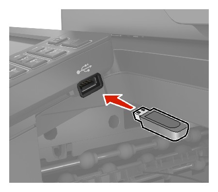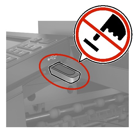 | Advertencia: Posibles daños: No manipule la impresora ni la unidad flash en la zona que se muestra mientras esté imprimiendo, leyendo o escribiendo en el dispositivo de memoria. Se pueden perder datos o no funcionar correctamente. |