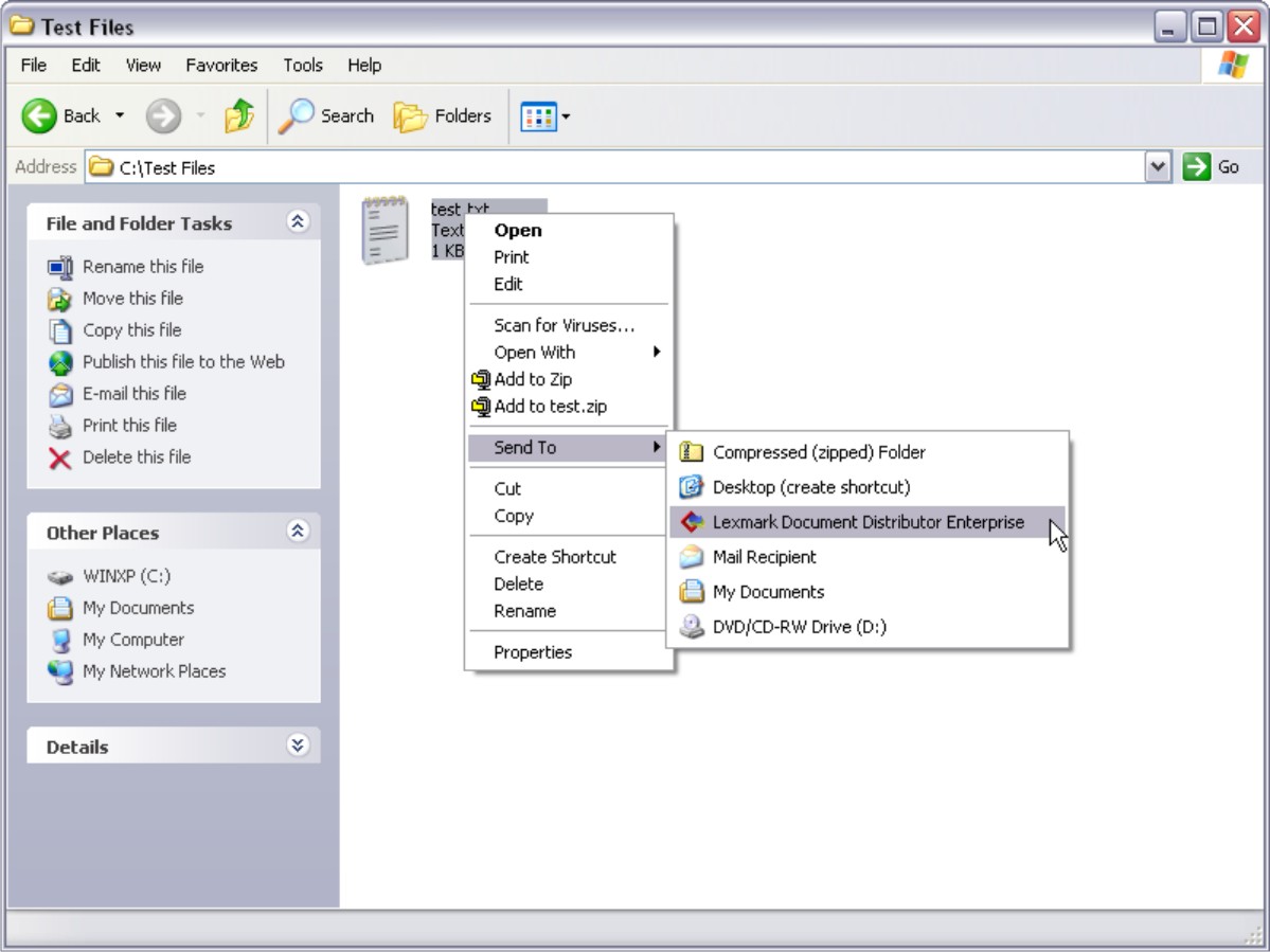 Right-click the file that you want to submit to LDD, and then click Send To > Lexmark Document Distributor Enterprise .