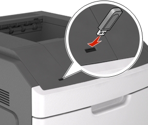| אזהרה-נזק אפשרי: אל תיגע במדפסת או בכונן ההבזק באזורים שמוצגים במהלך הדפסה, קריאה או כתיבה פעילות מתוך התקן זיכרון. עלול להתרחש אובדן נתונים. |