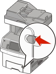 Press the tray release latch to the left, and then pull the multipurpose tray down.